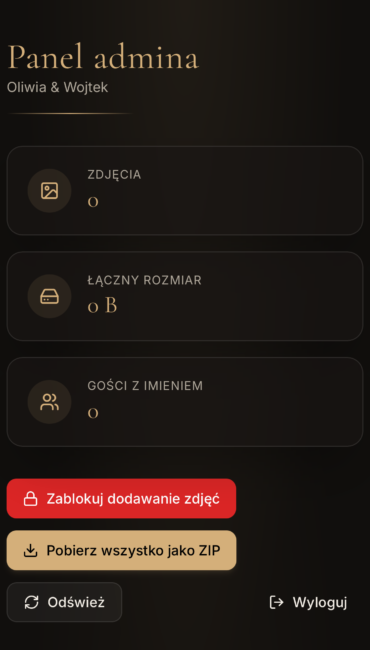 Po weselu jest specjalnie przygotowany panel admina, gdzie można pobrać całą paczkę zdjęć.